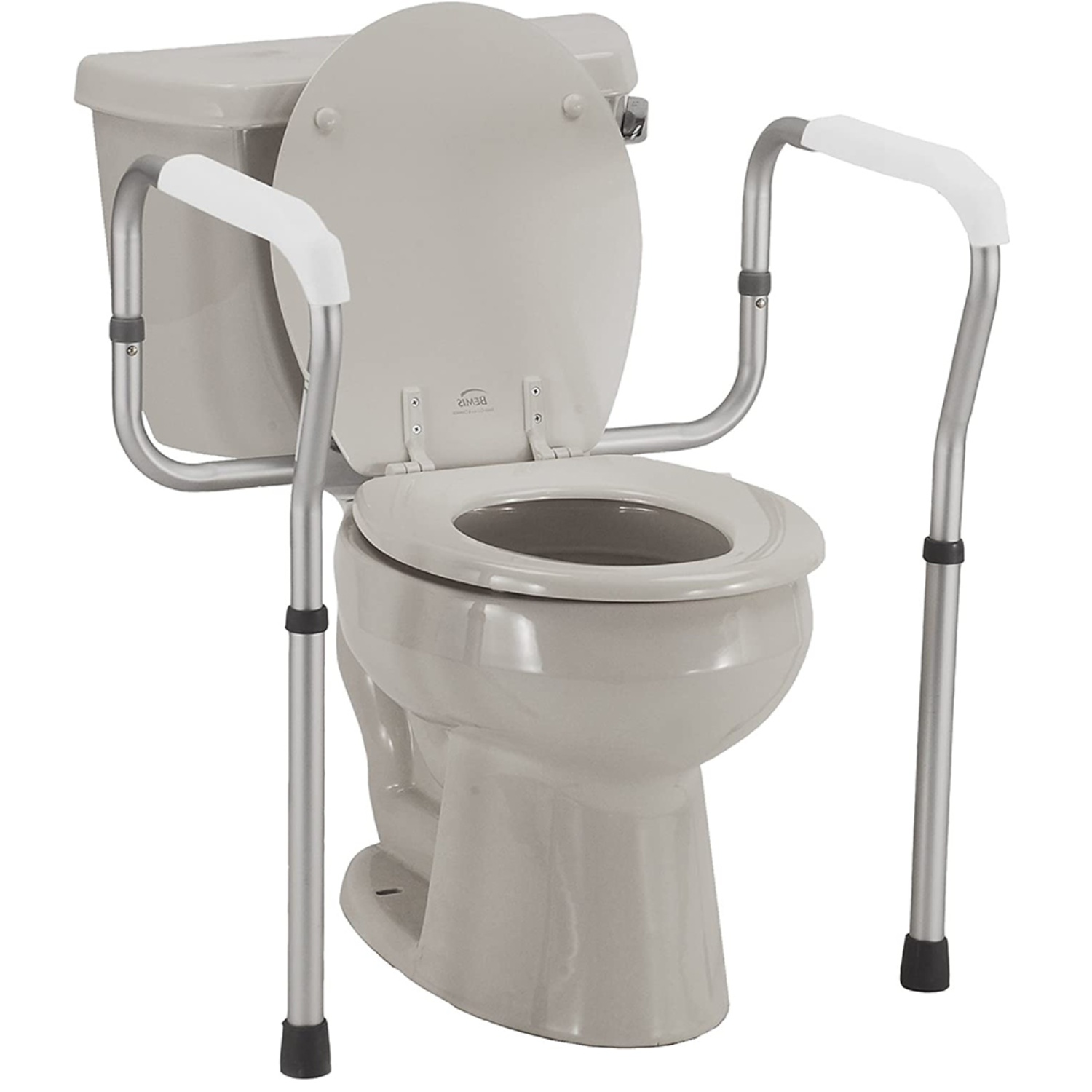 The toilet safety rails have a one piece mounting design for easy width adjustment. The rails bolt securely to the toilet. Fits toliet seat heights from 13.5″ – 17.5″
