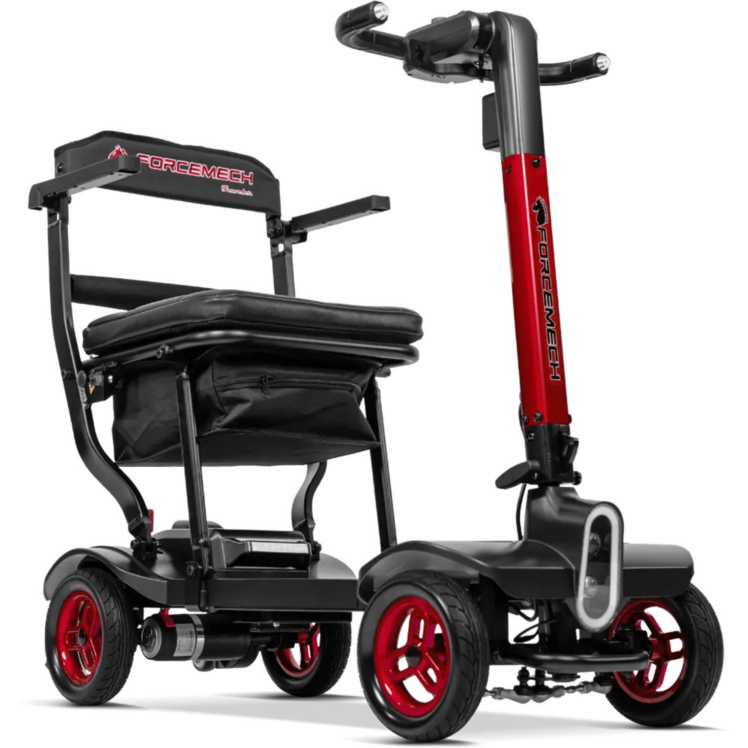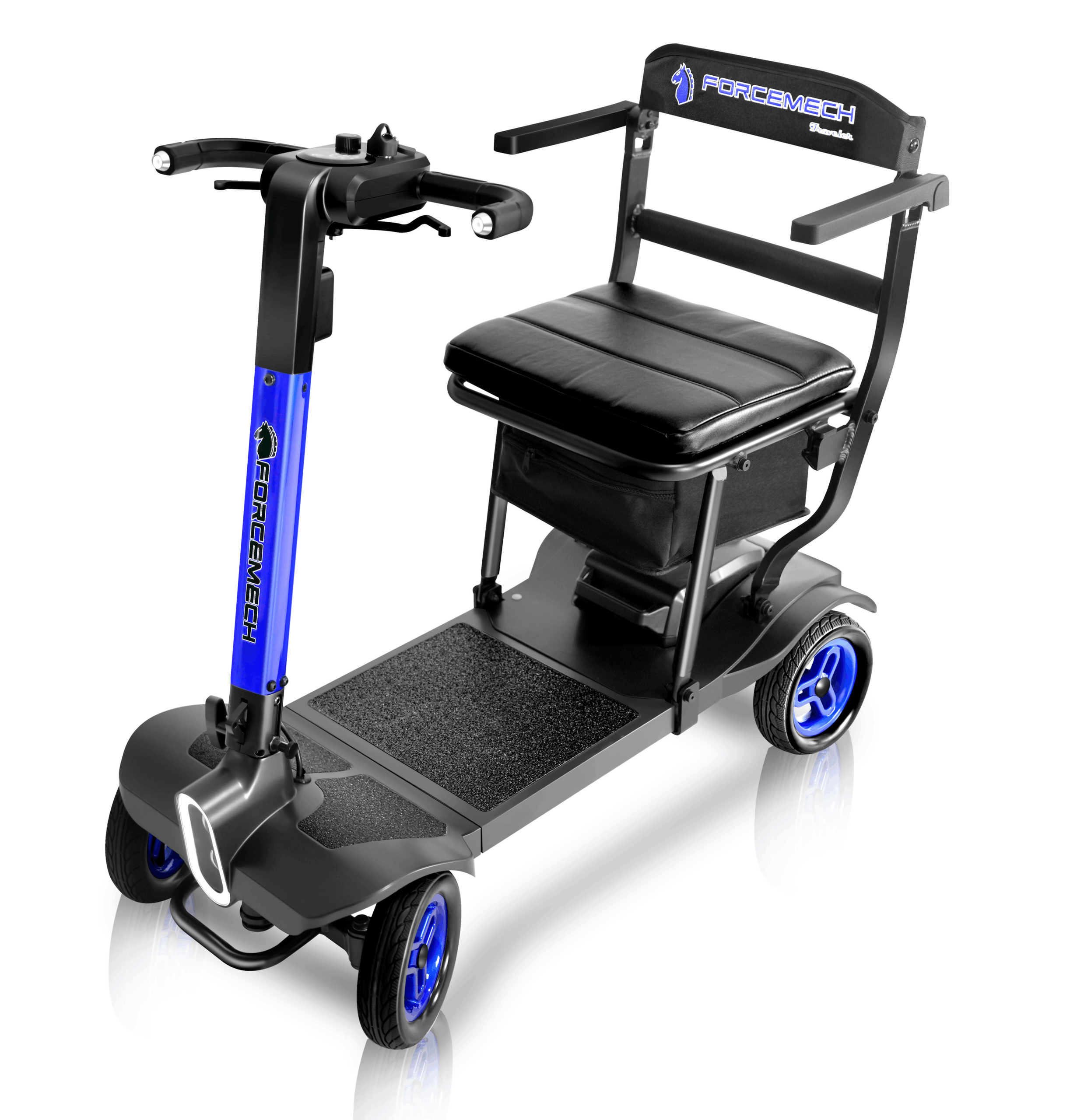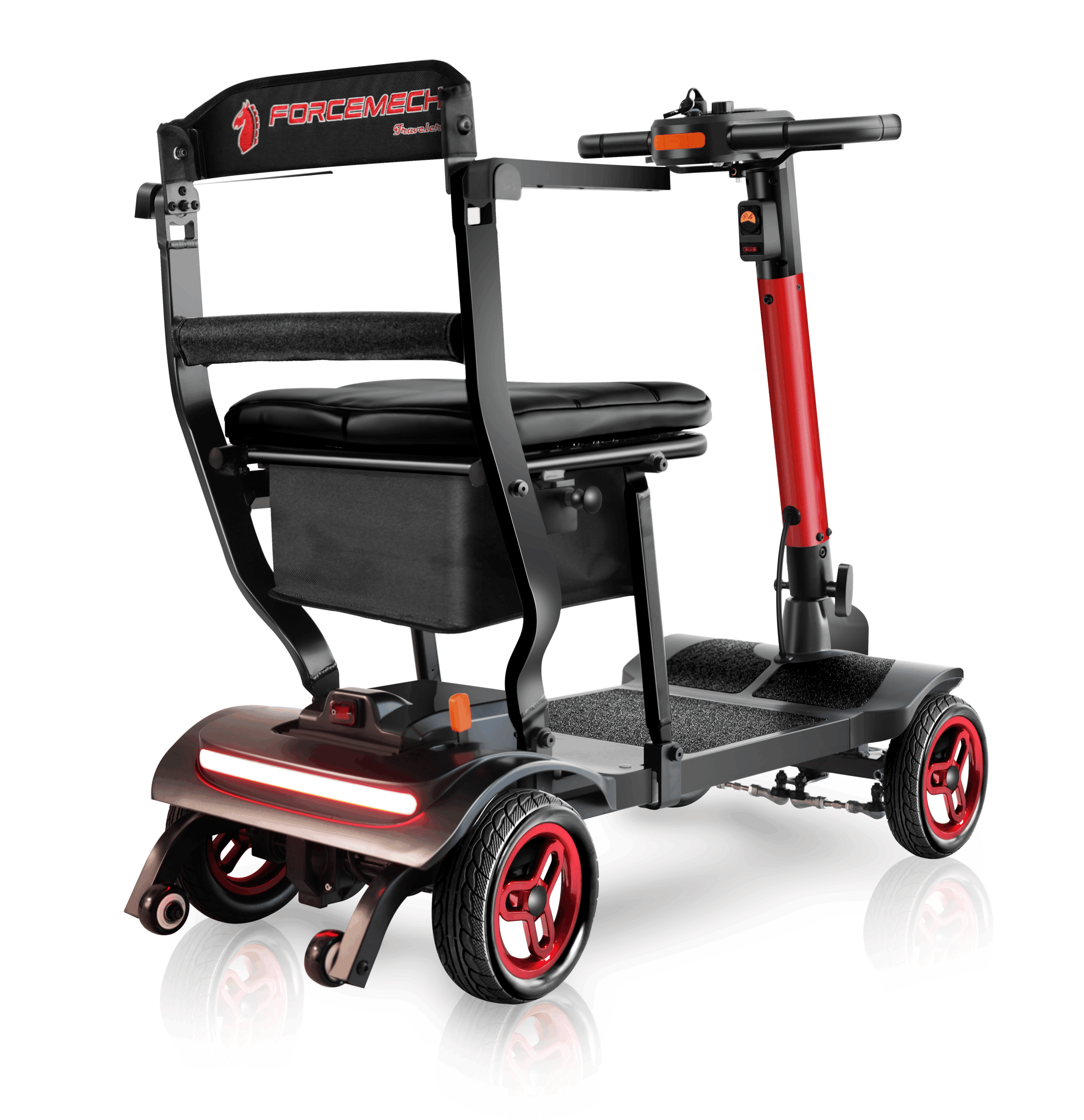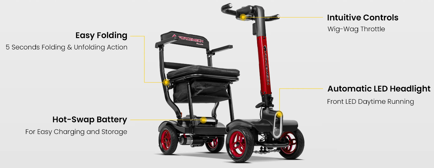 The Traveler is a power scooter designed by Forcemech for effortless portability, folding in as little as 5 seconds for quick storage and transport. Weighing just 38lbs without a battery, it’s sleek, portable, and ready for easy transport.