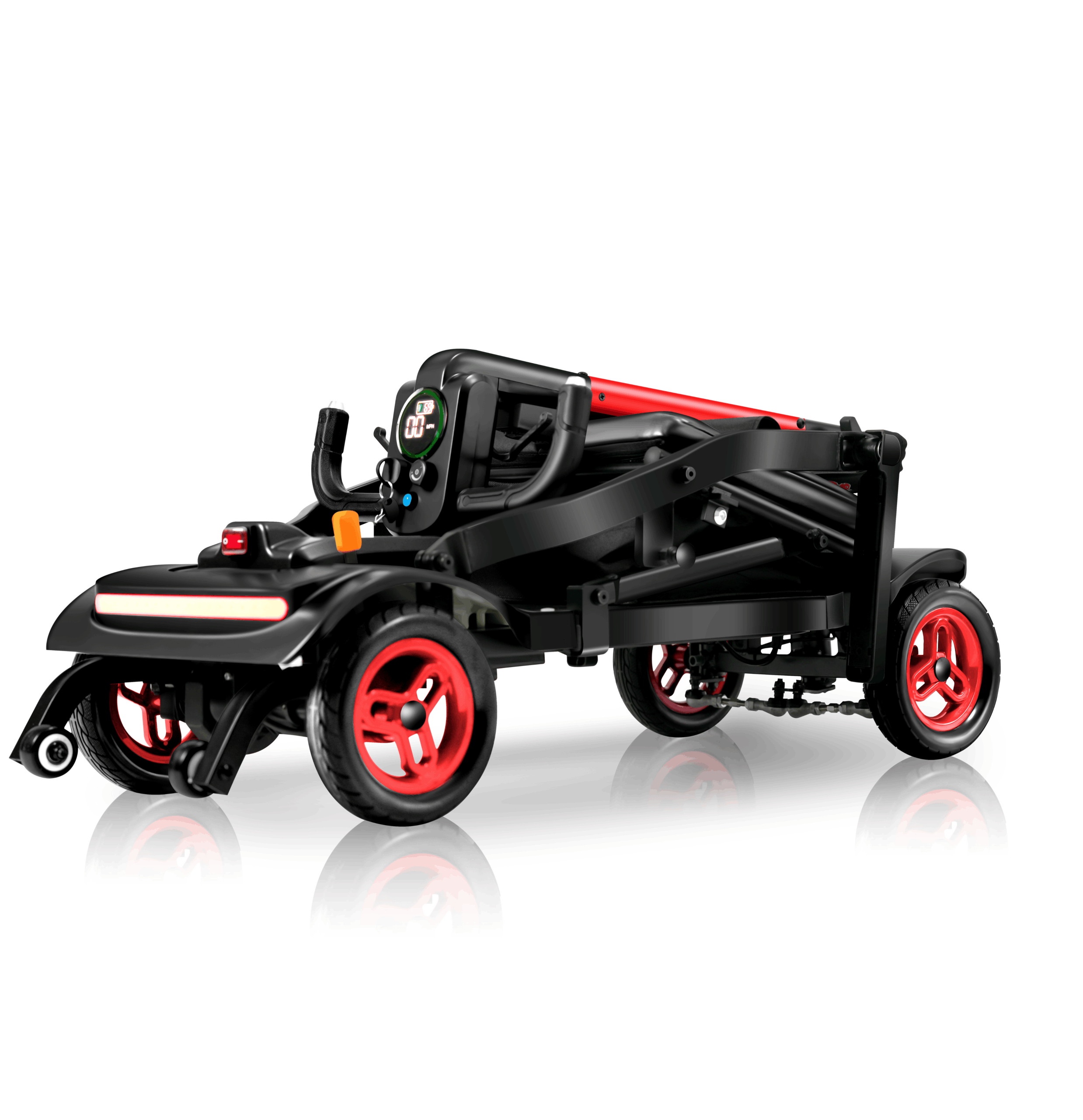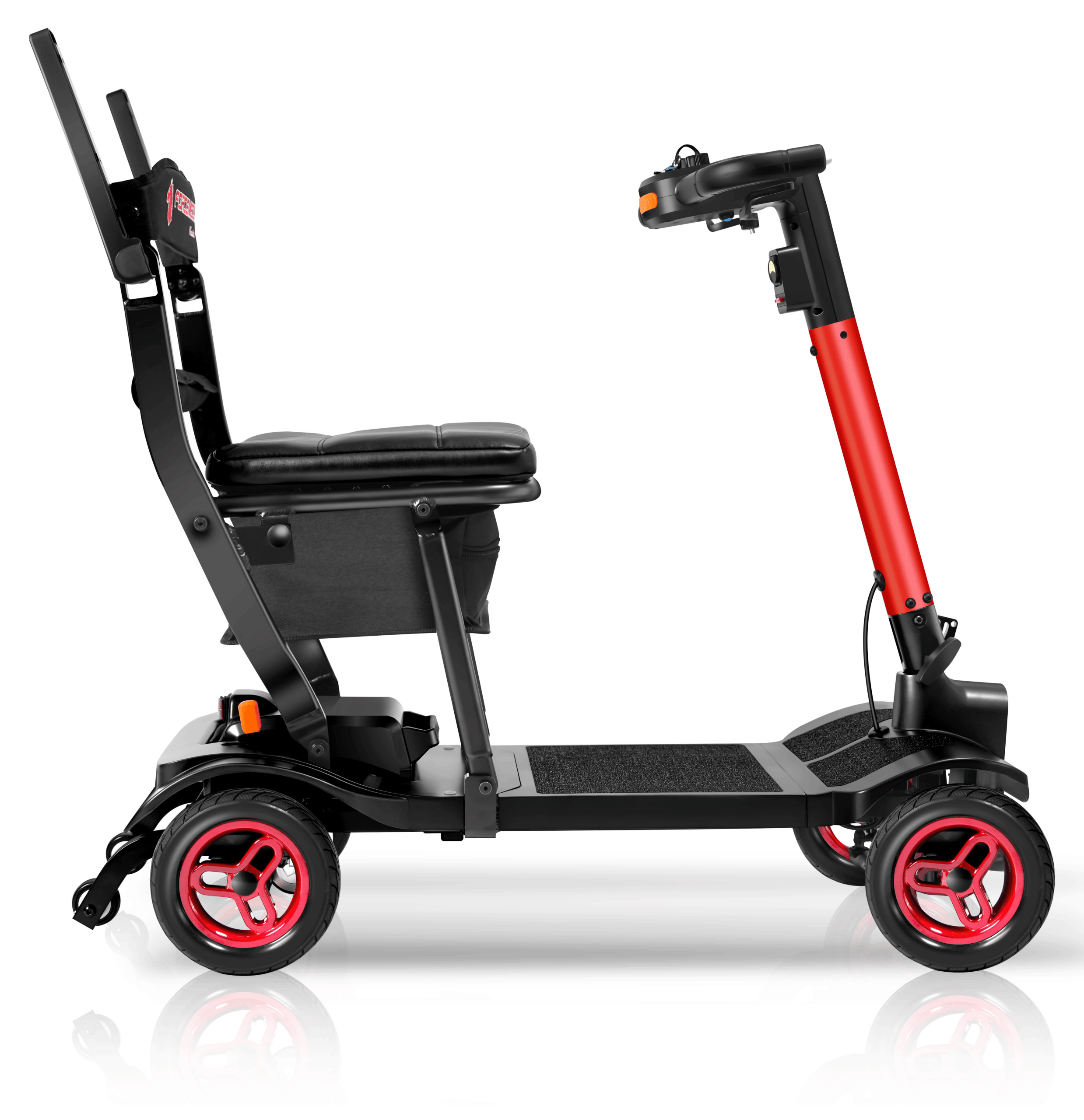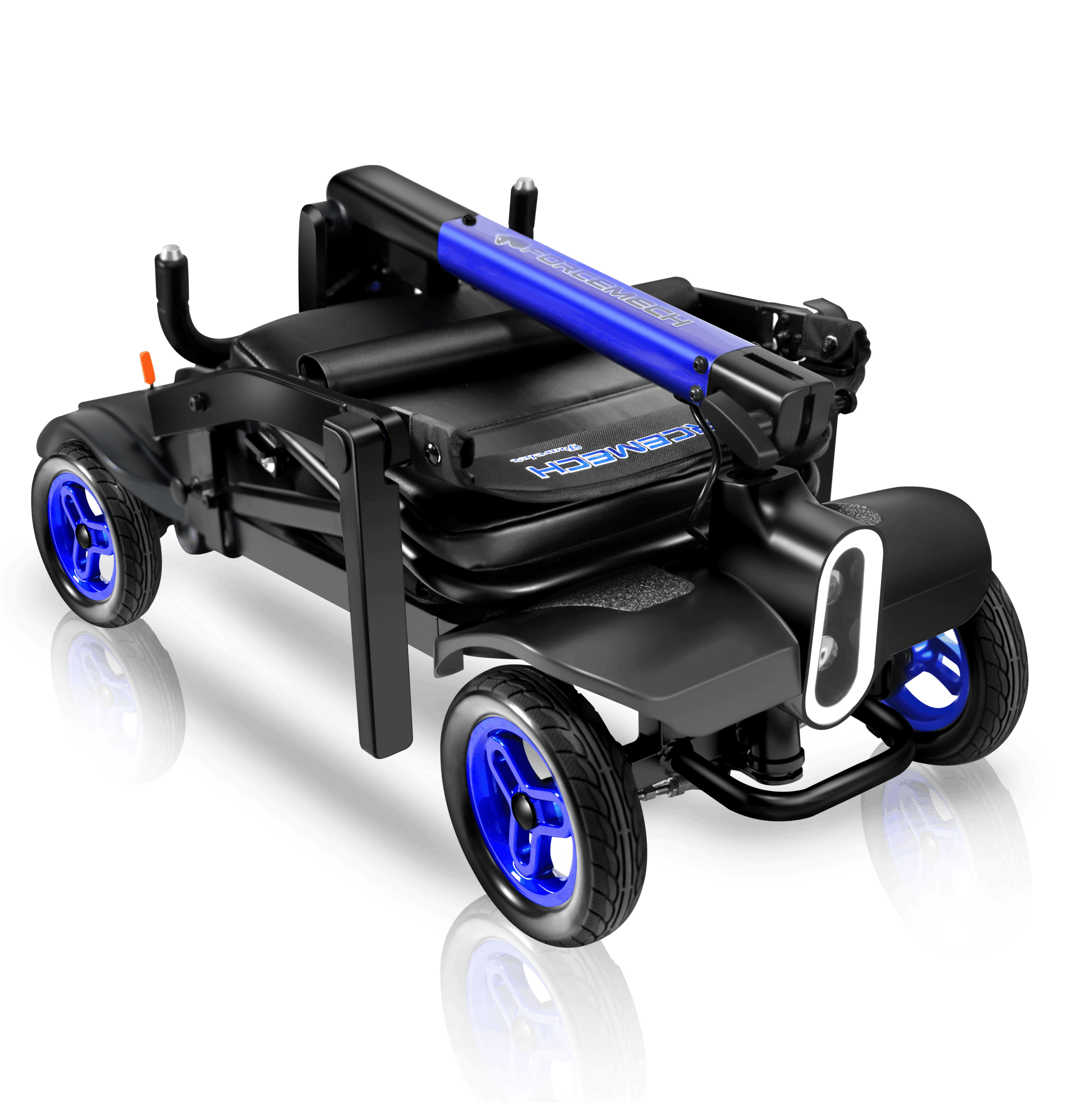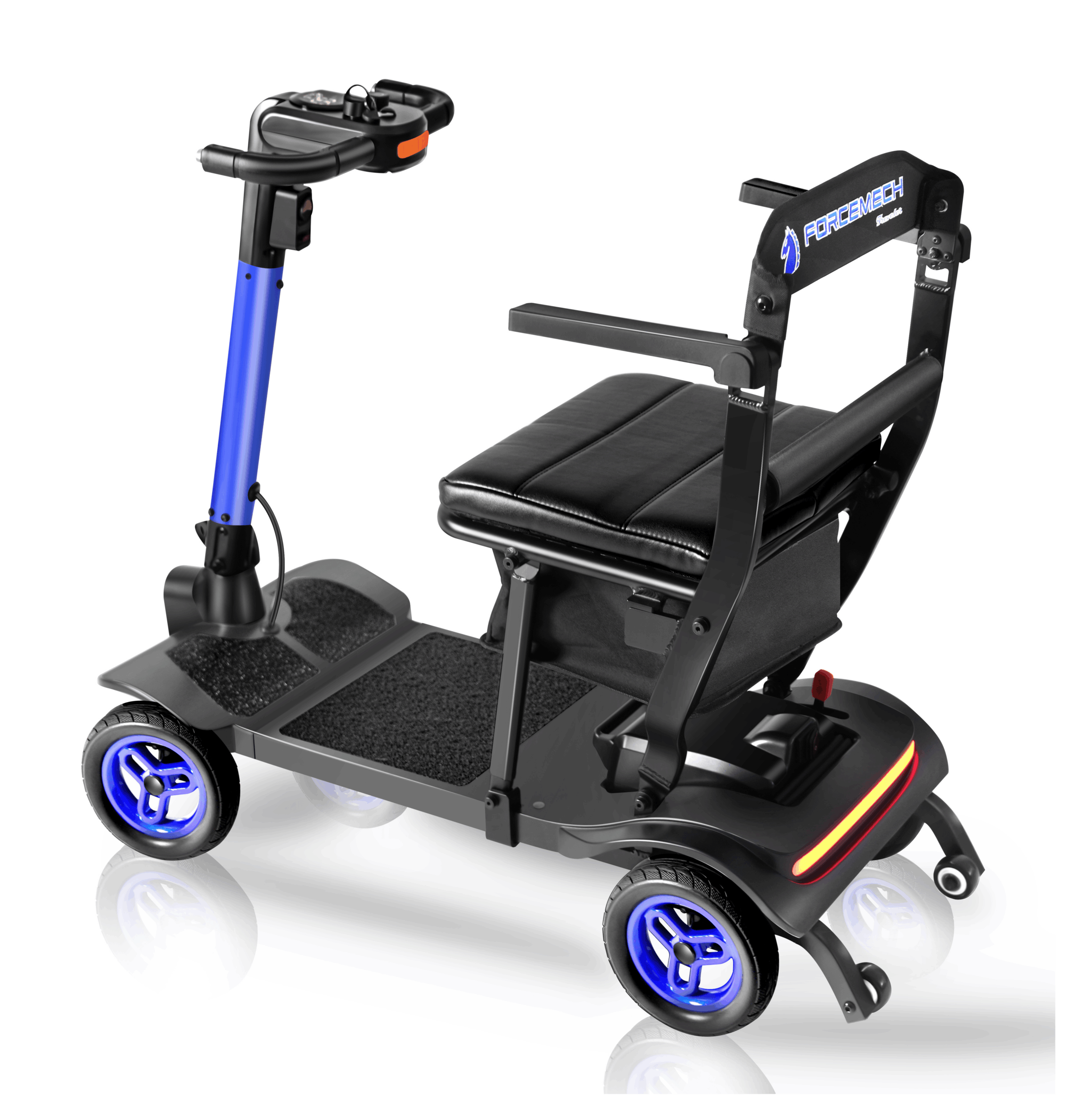 The Traveler is a power scooter designed by Forcemech for effortless portability, folding in as little as 5 seconds for quick storage and transport. Weighing just 38lbs without a battery, it’s sleek, portable, and ready for easy transport.